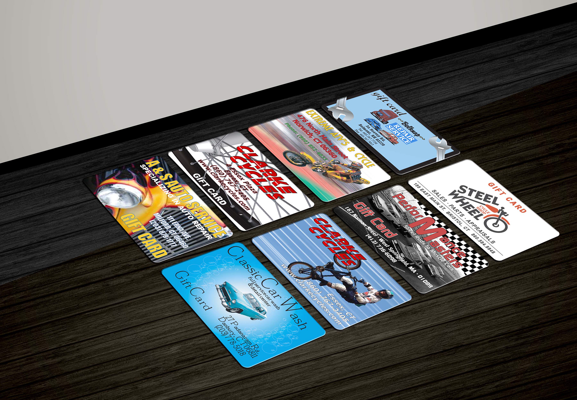 Gift cards I designed and printed for local small businesses while working at Capital Transfer Inc. Most are original illustrations. I often had to identity fonts and create logos.